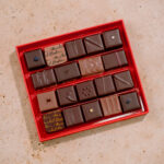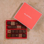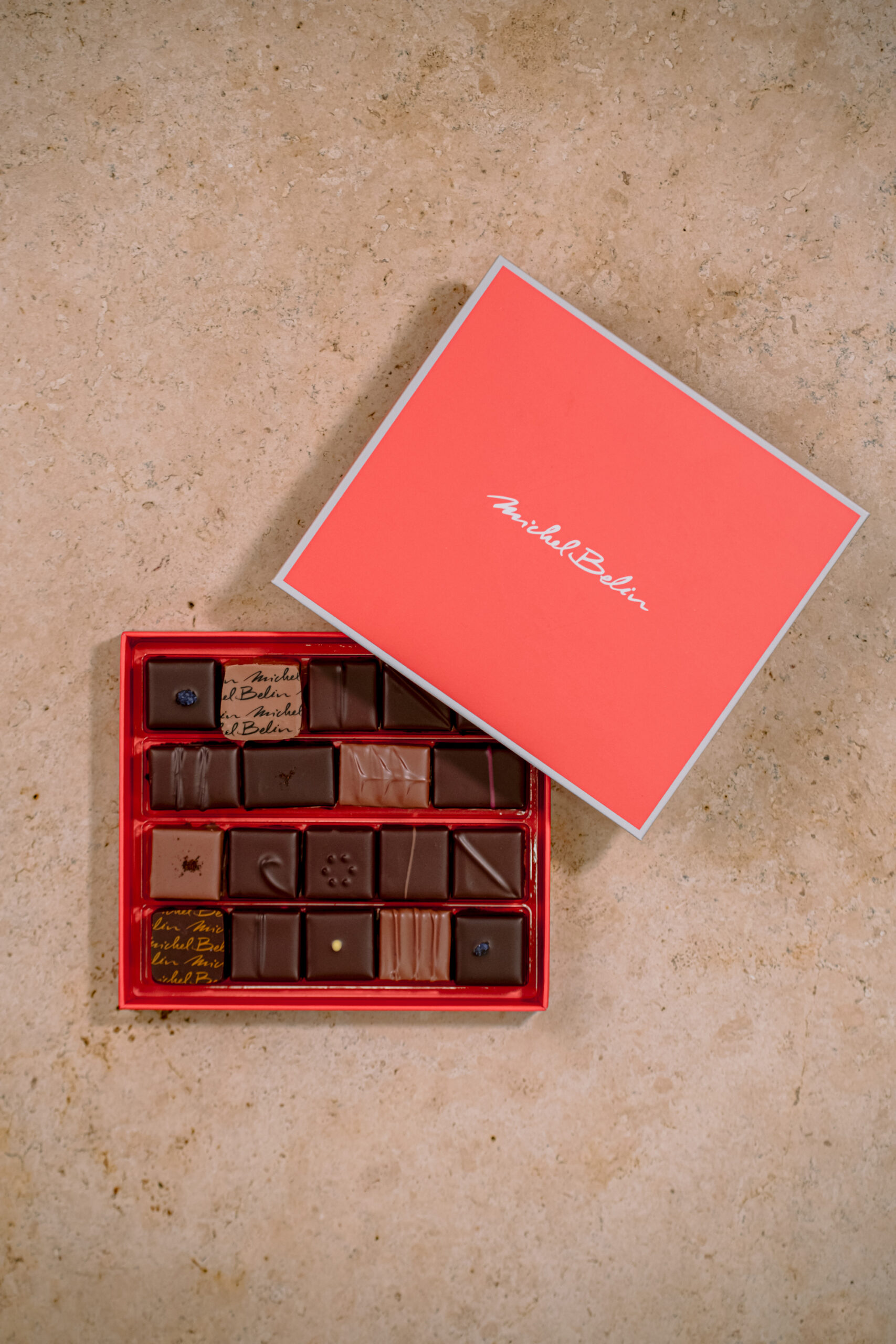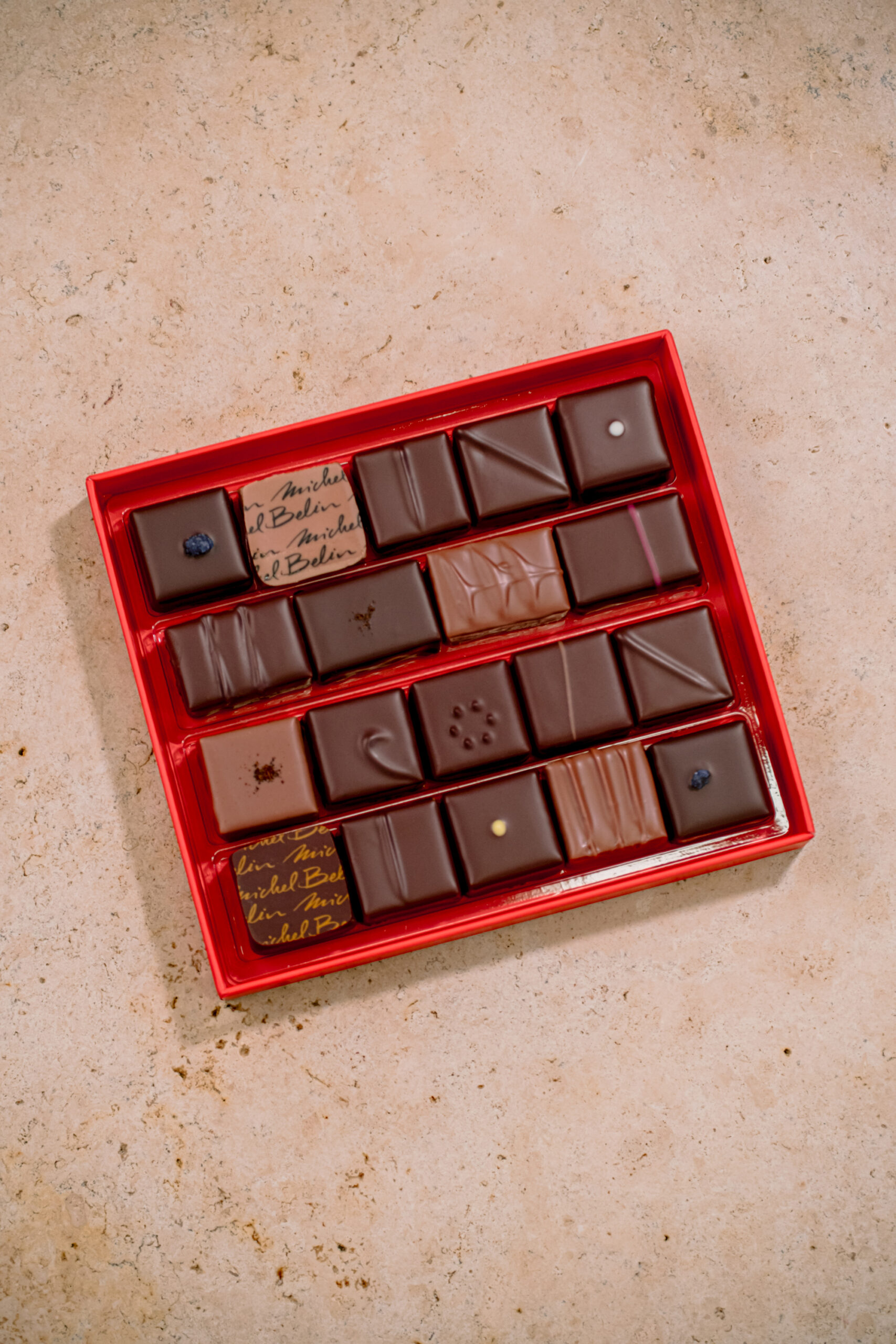 Ingrédients : chocolat de couverture au pur beurre de cacao (pâte de cacao, sucre, beurre de cacao, lécithine de tournesol), beurre de cacao, lait, sucres, miel, crème fraîche, alcools, fruits secs et à coques (amandes, noix, noisettes, cacahuètes, sésame, graines de tournseol, noix de coco, fèves de Tonka, pistaches), farine de blé, oeufs, sel, pulpes de fruits (fraise, framboise, poire, abricot, cassis, banane, pamplemousse, orange, citron, mirabelle), vanille en gousse, café, thé, anis, menthe, chicorée, gingembre, épices, canelle, fleur d’oranger, eau de rose, arômes naturels, sans conservateur.