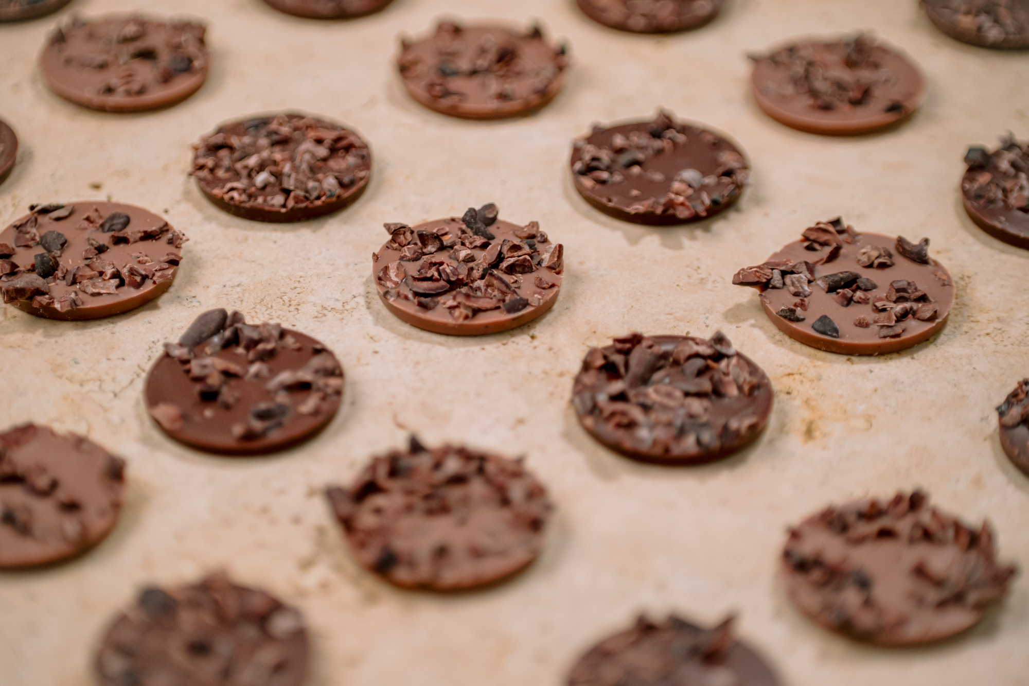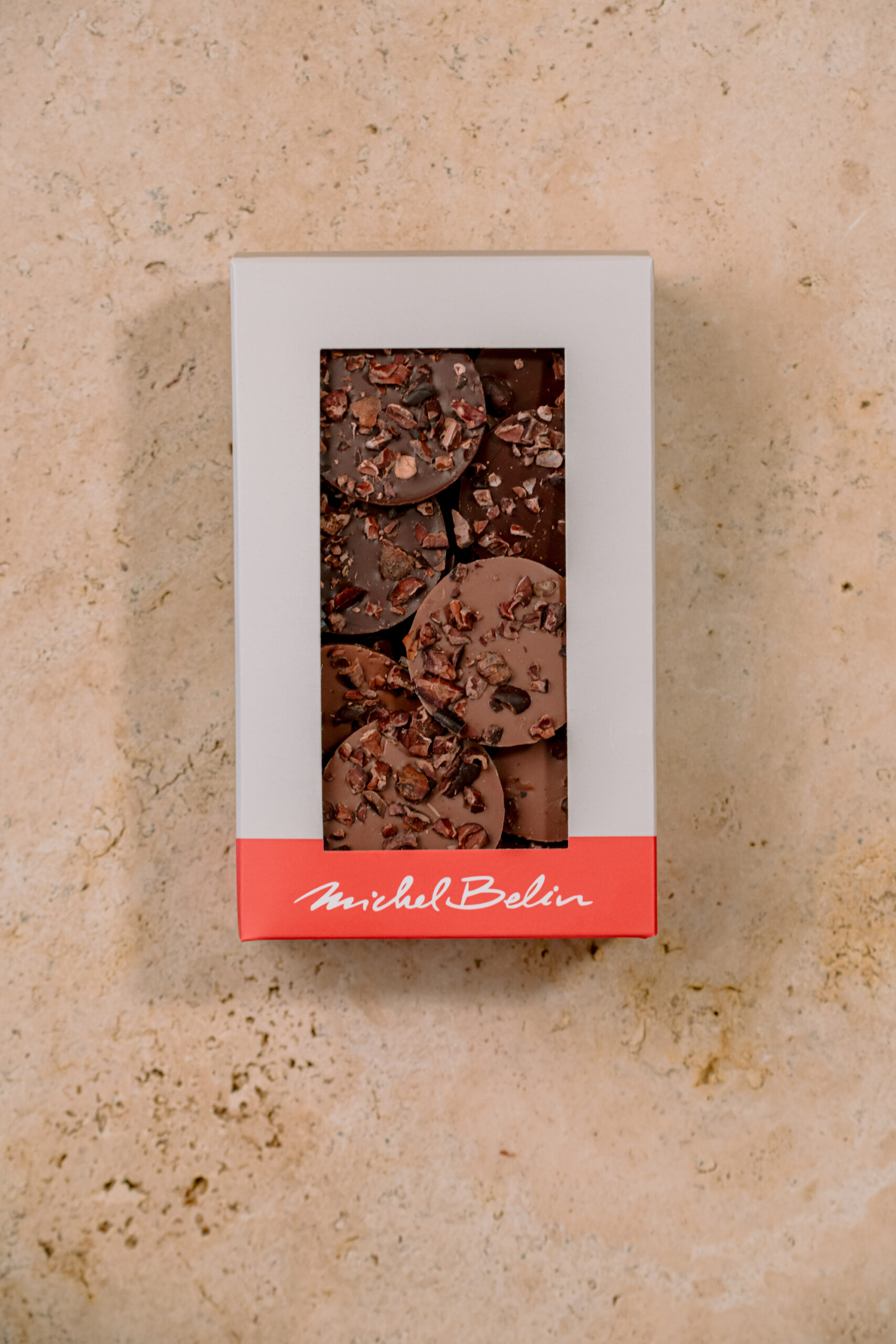 Palets de chocolat noir ou au lait parsemés de fèves de cacao broyées. Doublement croquantes, les pastilles au grué de cacao qu’elles soient de chocolat noir ou au lait accompagnent tout en légèreté une boisson chaude, thé ou bien sûr café.