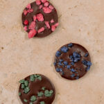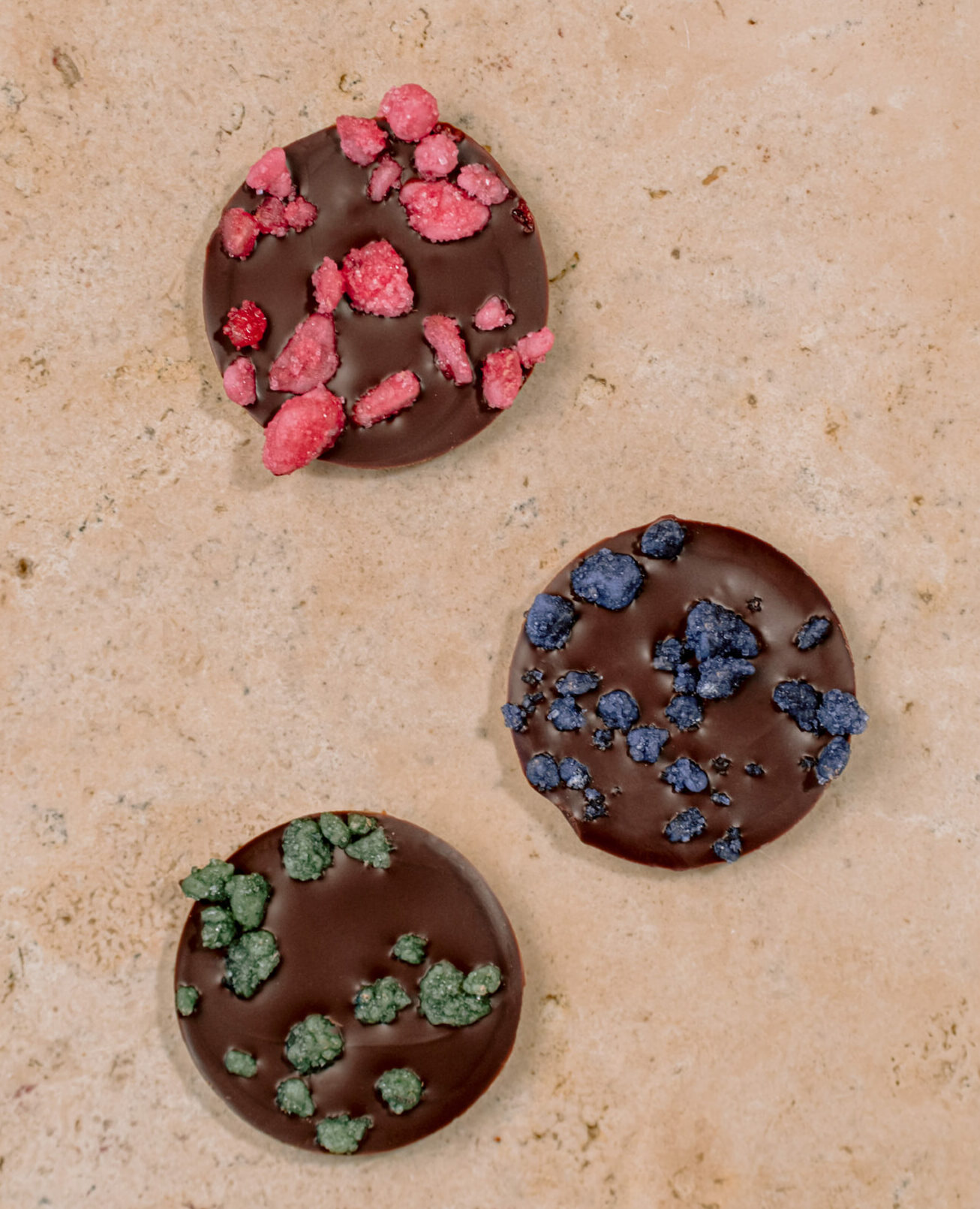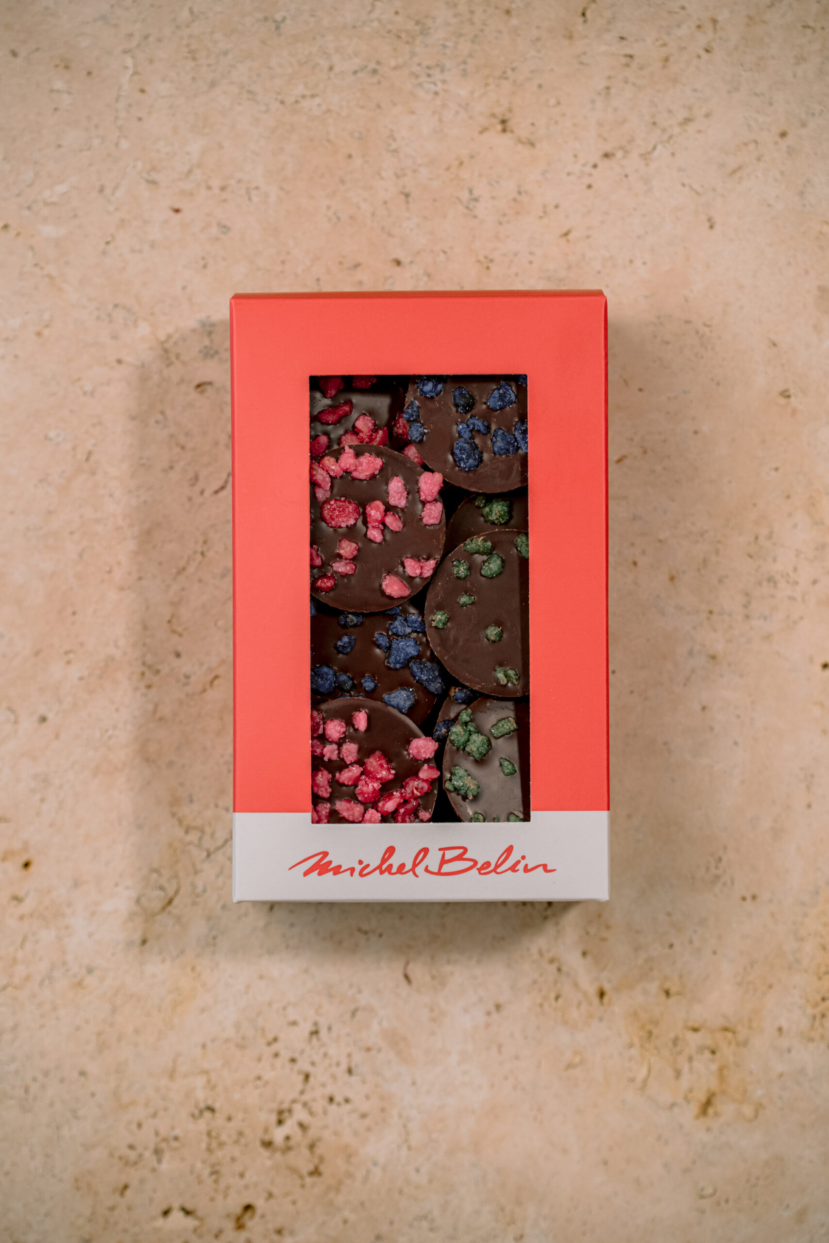 Éclats cristallisés de pétales de rose, de violette, de feuilles de menthe, parsemés sur des palets de chocolat noir à 70% de cacao. Ces petits délices aux brins colorés sont l’idéal pour improviser une petite pause légère à toute heure de la journée.