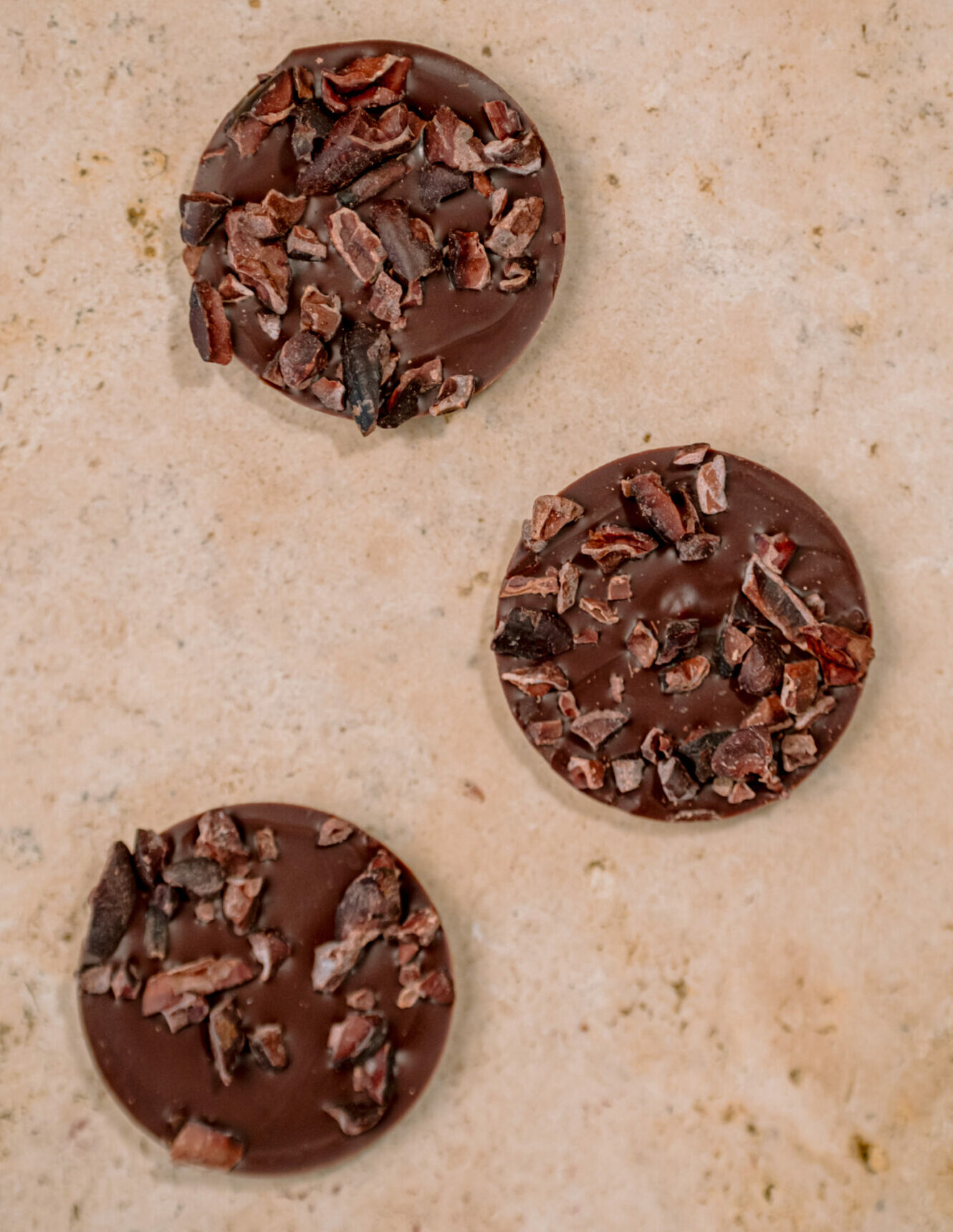 palets de chocolat noir Cameroun 70% fabriqué dans notre atelier de torréfaction à Albi, décorés avec des éclats de fèves cacao. Un bonheur simple à l’état brut.