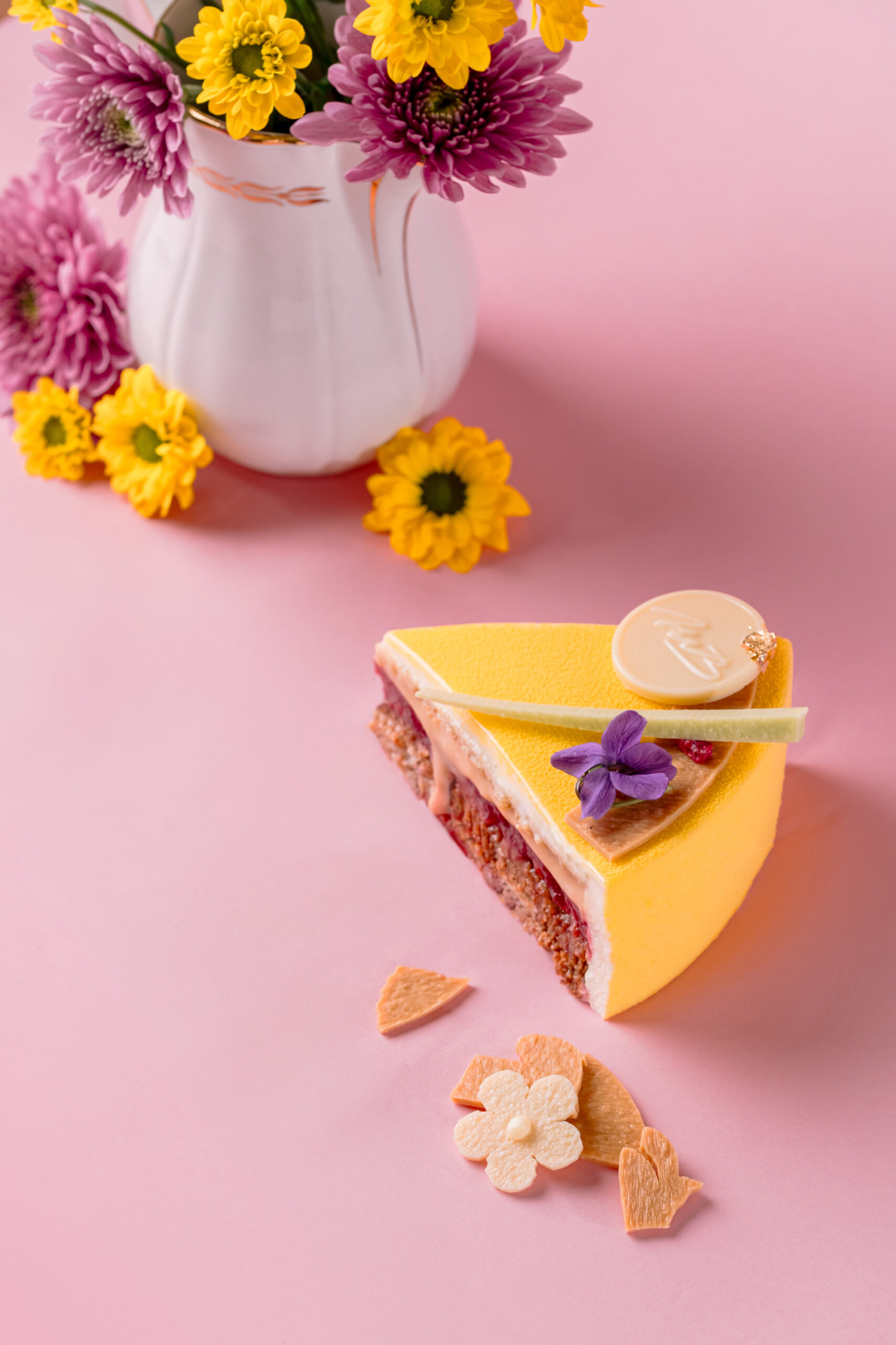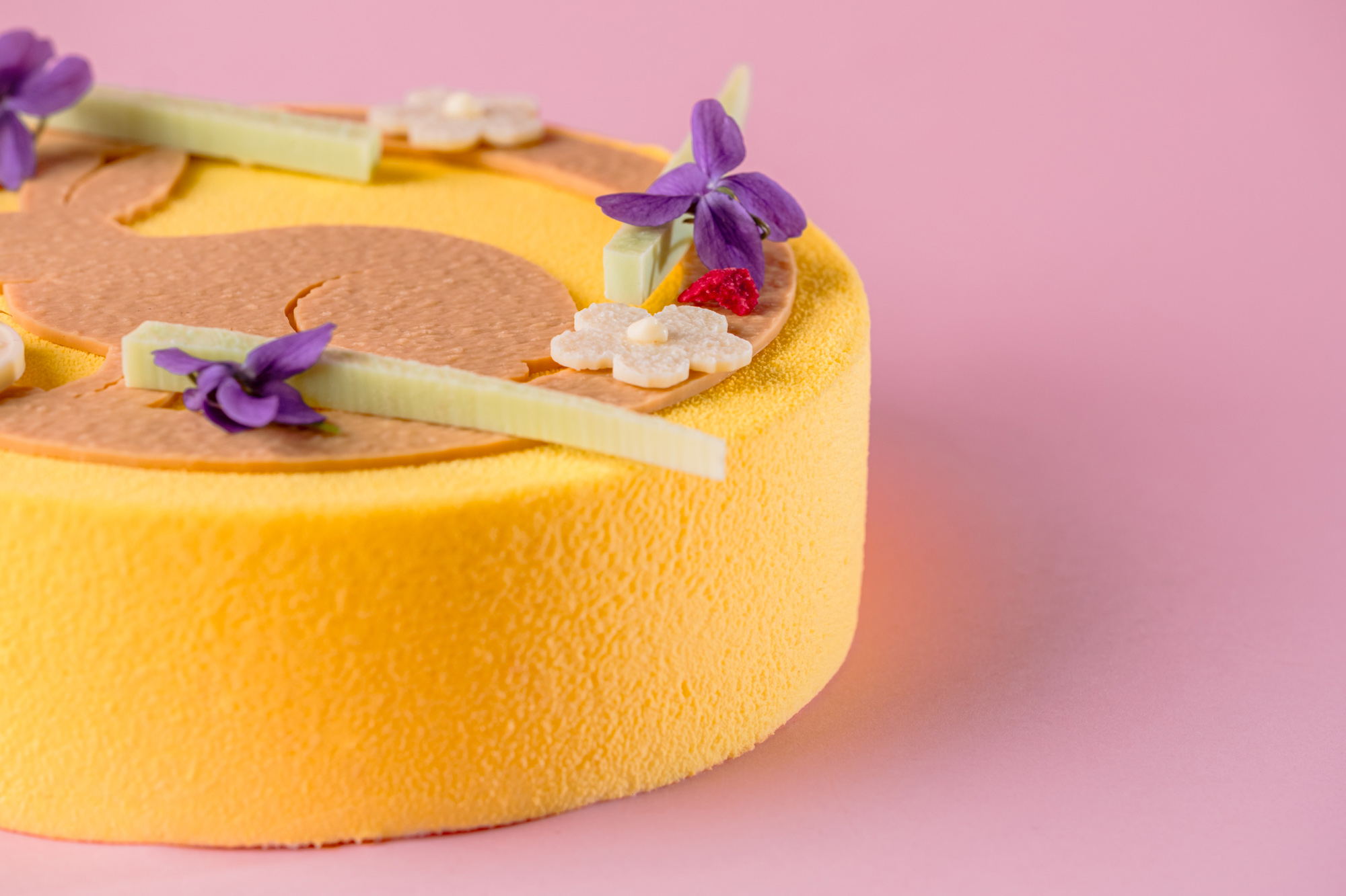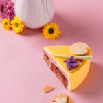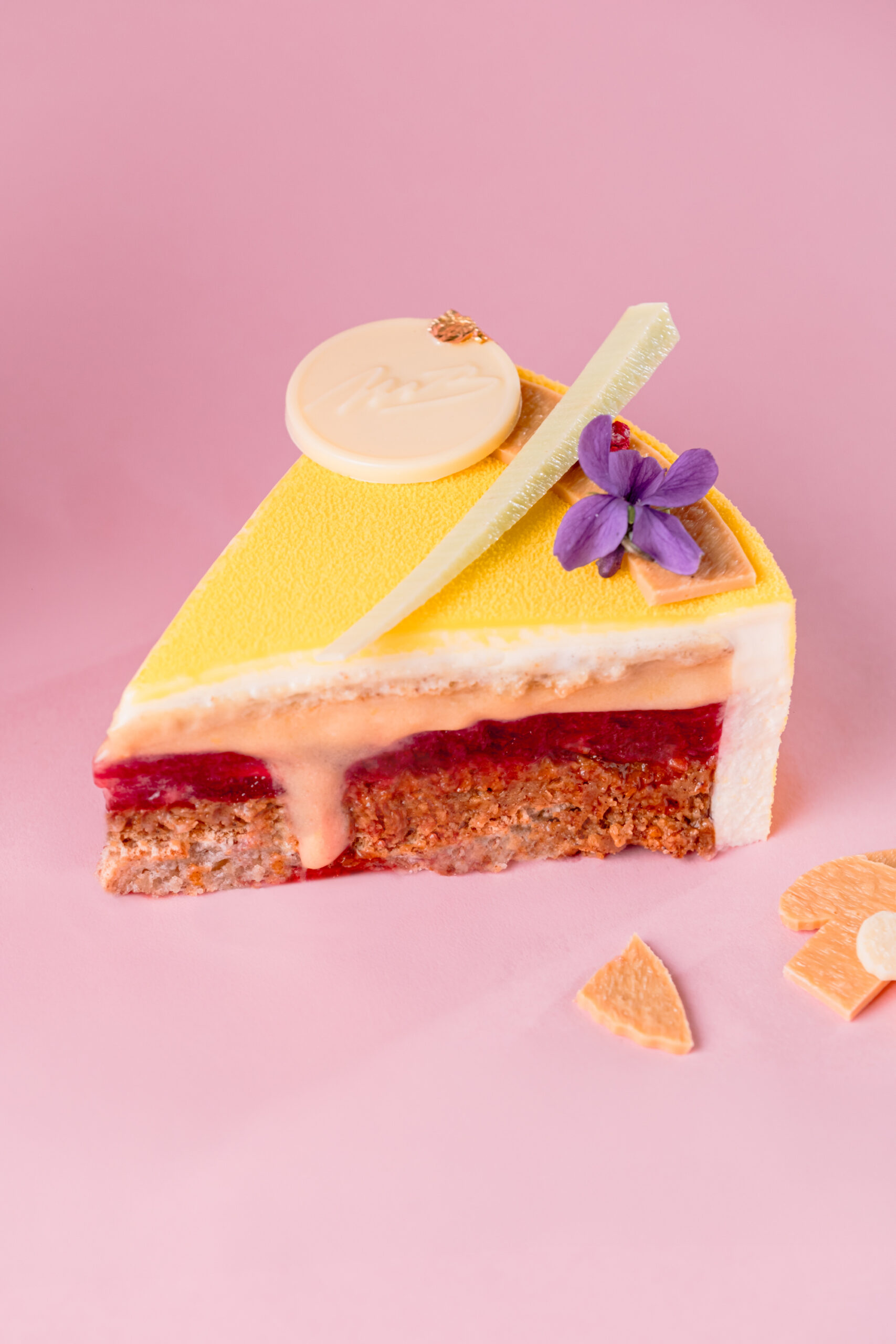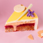 CRÈME liquide stérilisée UHT (stabilisant : carraghénanes), Pulpe framboises, Sucre, NOISETTES, AMANDES, Blanc d’OEUF liquide pasteurisé (stabilisants : E412, E415), Jus de citron jaune, Feuilletine, Eau, BEURRE concentré, Sirop glucose DE40, Chocolat Lait (LAIT), OEUF entier liquide pasteurisé, LAIT 1/2 écrémé, Gélatine de boeuf, Farine BLÉ, Agar-agar en poudre (Gélifiant : E406, dextrose), Zestes de citron, Sucre inverti, Gousse de vanille.