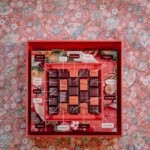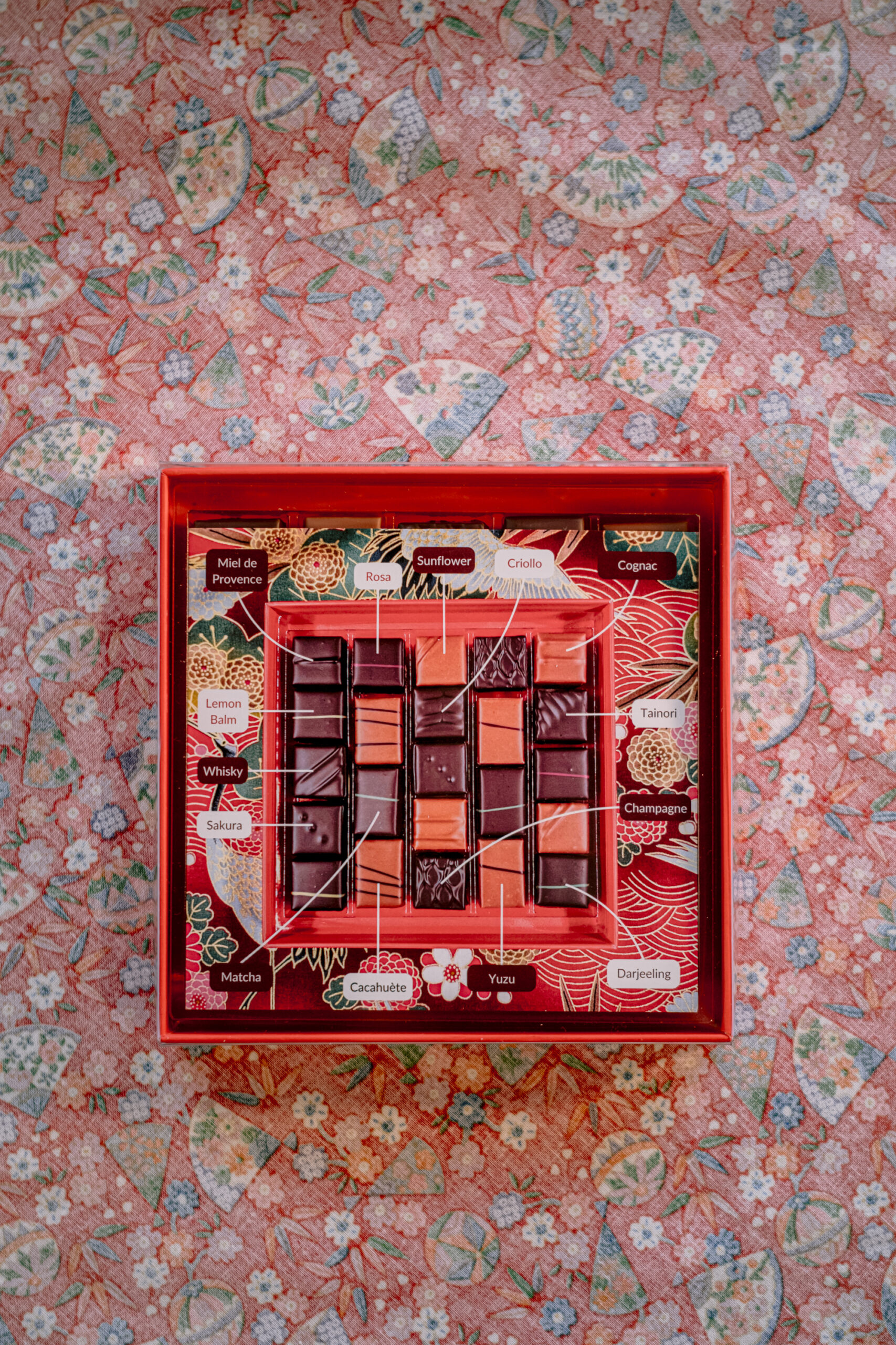 Pâte de cacao, crème fraiche, sucre, lait, beurre de cacao, fruits secs et à coques (amandes, noix, noisettes, sésame, cacahuètes, graines de tournesol, noix de coco, fèves de Tonka, pistaches), sirop de glucose, trimoline, sorbitol, farine de blé, œufs, alcools, pulpes de fruits (orange, citron vert, fraise, framboise, cassis, abricot…) café, thé, anis, menthe, chicorée, gingembre, cannelle, fleur d’oranger, réglisse, eau de rose, arômes naturels, lécithine de soja, vanille, sel, miel. Colorants : Colorants à partir de denrées végétales alimentaires colorantes : radis, cassis, pomme, carthame, citron, spiruline.