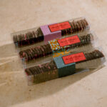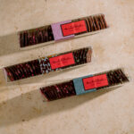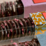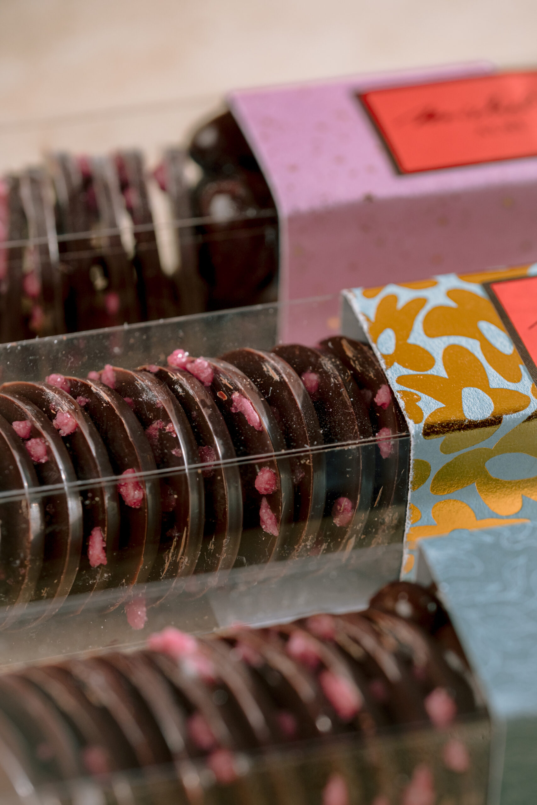 Chocolat noir, pâte de cacao, lait, beurre de cacao, sucre, fèves de cacao torréfiées et concassées, lécithine de tournesol, pétales de rose, violette, menthe naturelle, gomme d’acacia, E102, E120, E132
